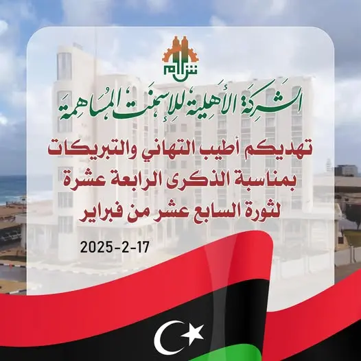 Chairman, members of the Board of Directors, the Executive Management, and all employees of the Company extend their sincere congratulations to the Libyan people throughout our beloved country on the occasion of the fourteenth anniversary of the February 17 Revolution, asking God to bless us with security, safety, and prosperity.Congratulations on the anniversary of the February Revolution