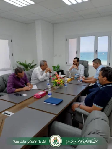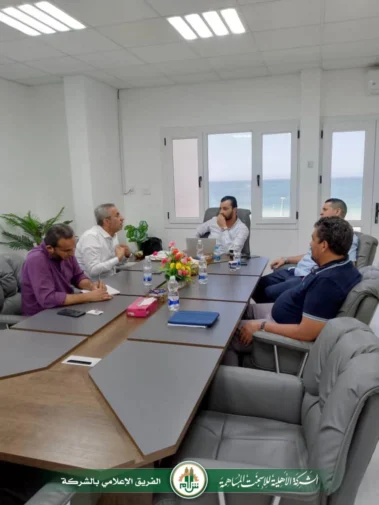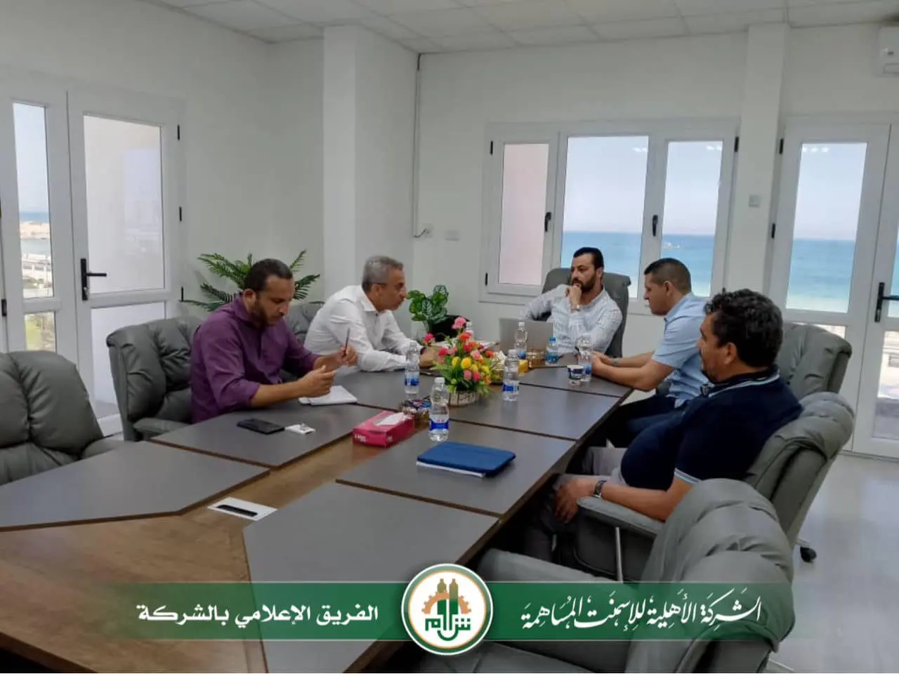 The meeting included the Chairman of the Board of Directors, Mr. Mustafa Fahil; the Executive Director, Mr. Mohammed Al-Hamali; and Sirte Gulf Gas Services Company. This meeting, the third, was held during which all executive procedures were completed, paths were identified, and all obstacles impeding the implementation of the project to connect the Souq Al-Khamis Cement and Building Materials Complex to gas were resolved.